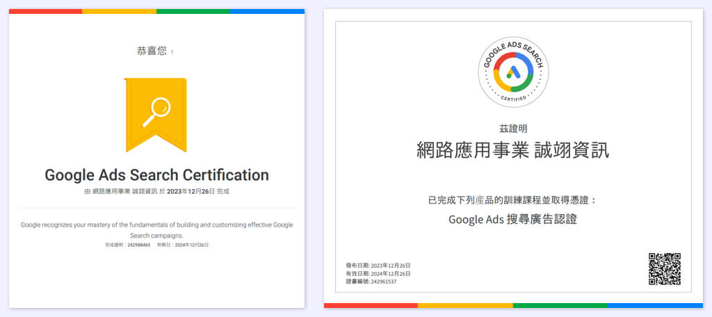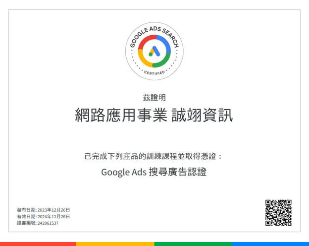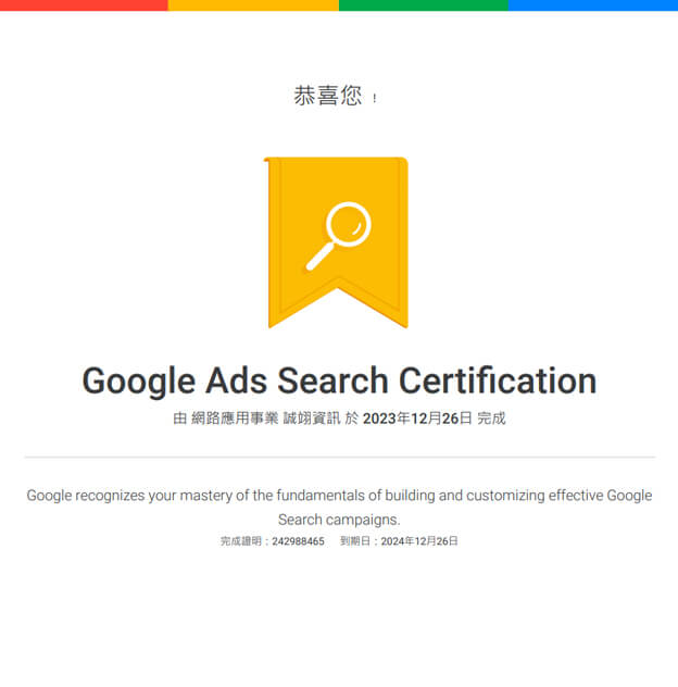 誠翊行銷團隊取得Google認證